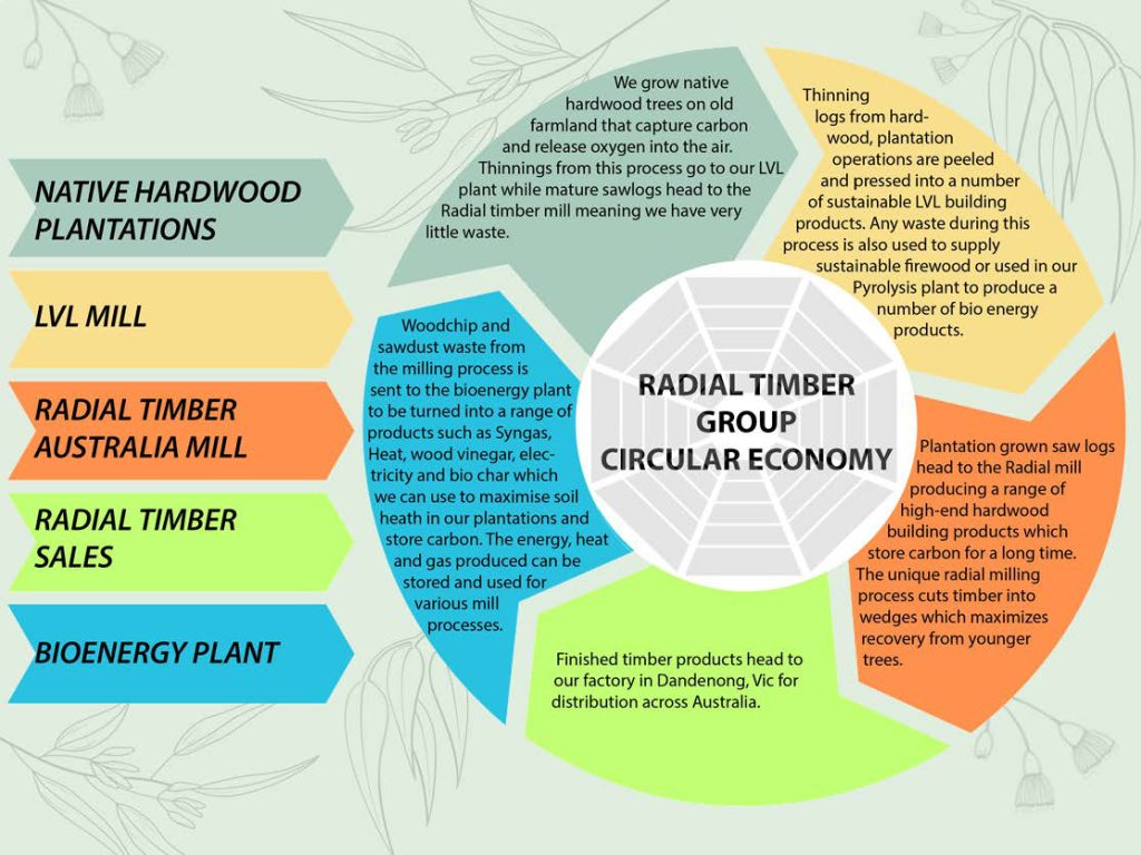 Radial Firewood effectively transforms waste and thinnings from our plantation estate into high-quality sustainable firewood. We utilize materials that aren’t suitable for LVL or saw logs due to size or quality, ensuring minimal waste through our milling process. This wood is then chopped, split, dried, and packaged for distribution across Victoria via our partner,